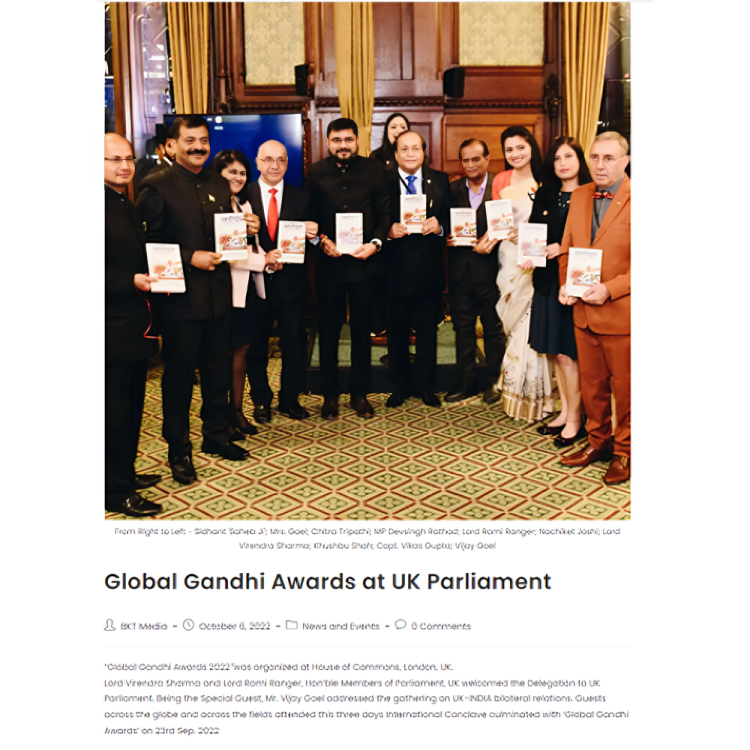 Organized series of conclave Under “New India Rising India” from 4th October 2019 to 7th October 2019 in London, UK to celebrate 150th Birth Anniversary of Mahatma Gandhi with a delegate of dignitaries from USA, UK & India.